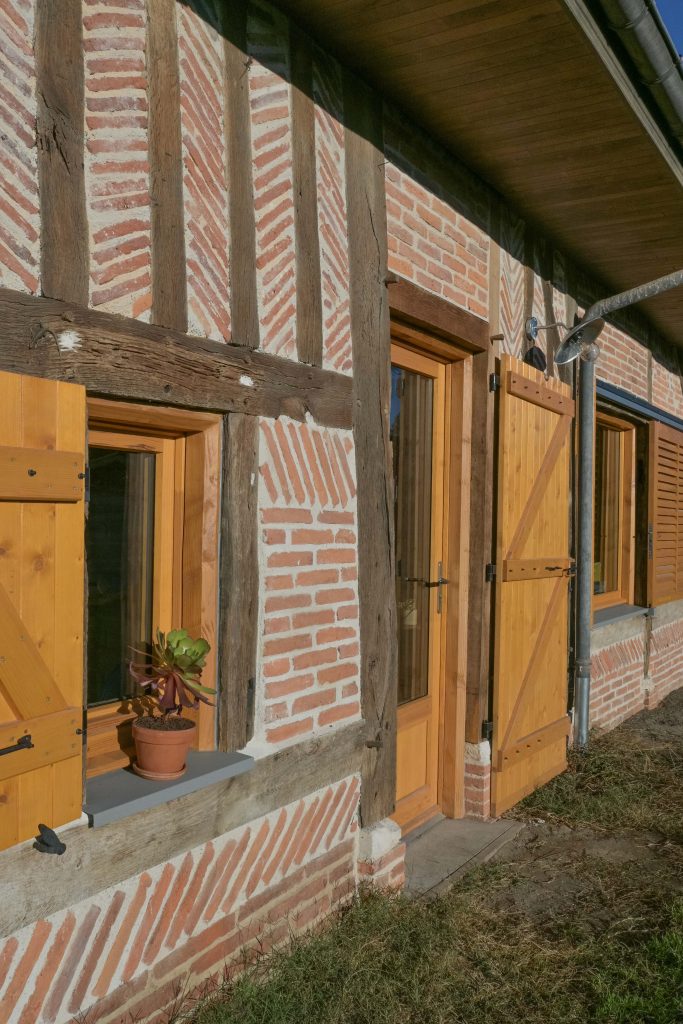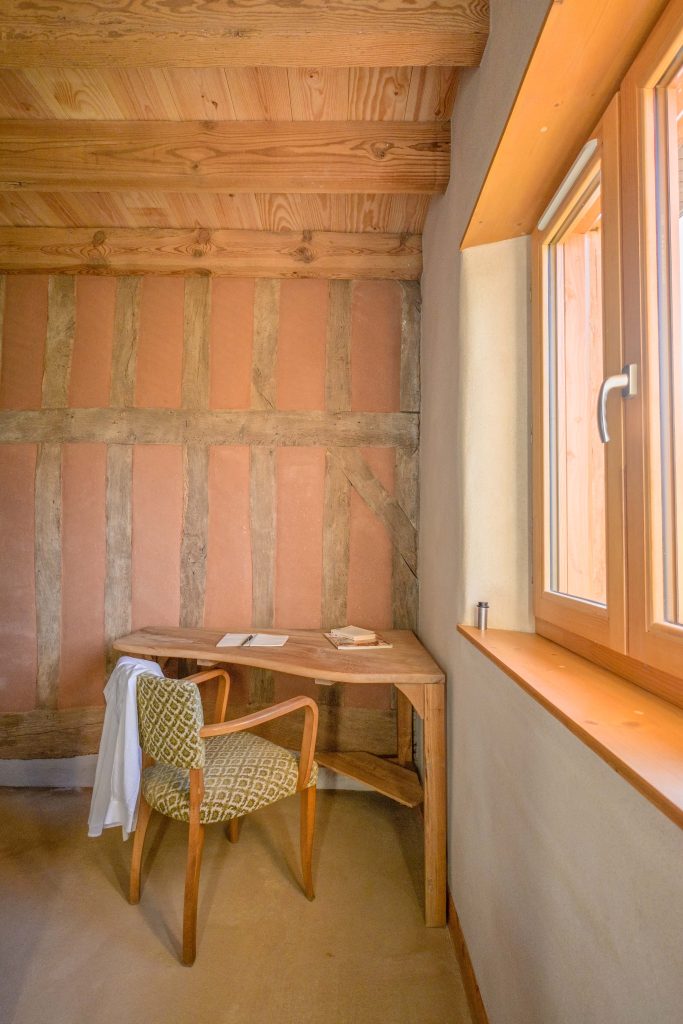 Un soin particulier a été apporté au choix des matériaux : terre crue, paille, bois, pierre, chaux, etc. tous naturels et, autant que possible, issus de filières locales. Les techniques de mise en oeuvre s’appuient sur des savoir-faire traditionnels et éco-responsables. Les anciennes tomettes, briquettes et les bois de charpente ont été soigneusement réemployés.