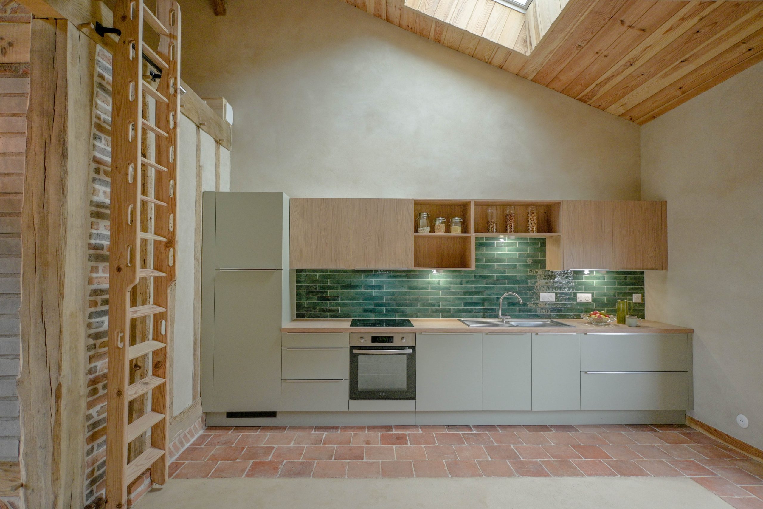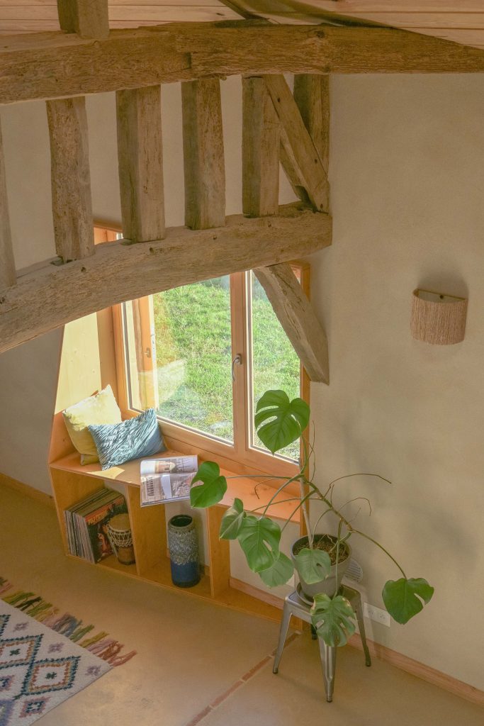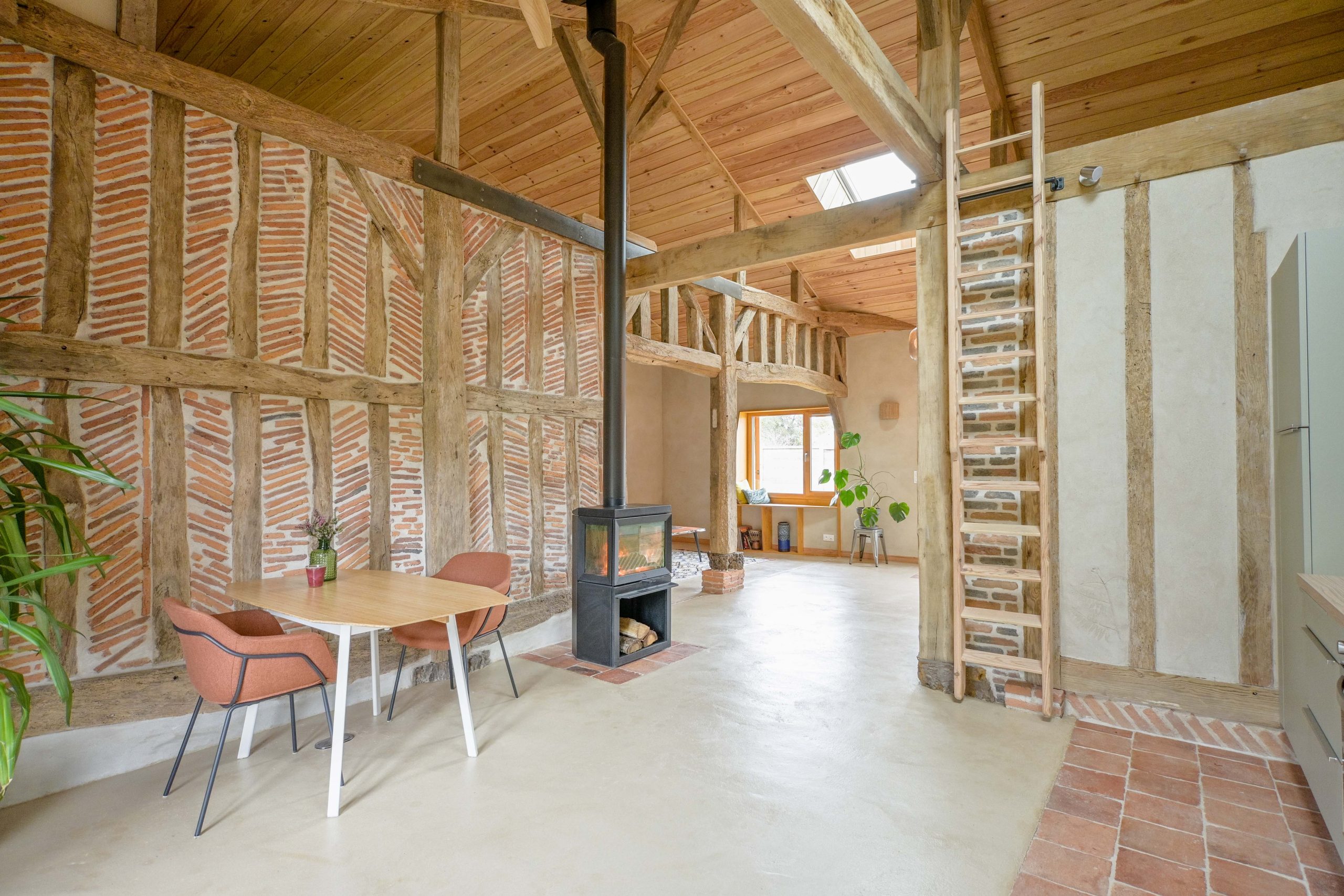 Dans l’Annexe, les anciens greniers ont été supprimés pour créer un plafond cathédrale révélant la charpente traditionnelle, et offrant un espace de vie ouvert, lumineux et chaleureux.